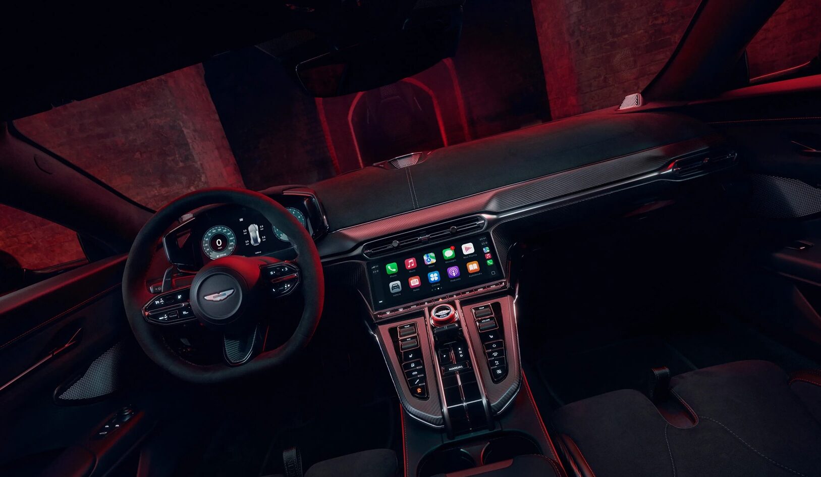 Vantage S introduces a heated sports steering wheel trimmed in Alcantara®, a lightweight material chosen for its performance feel and used throughout the cabin, from the headliner to the seats and center console. Finished in muted black with integrated heating and hands-on detection, it is also available with matching chrome accents to suit driver preference.